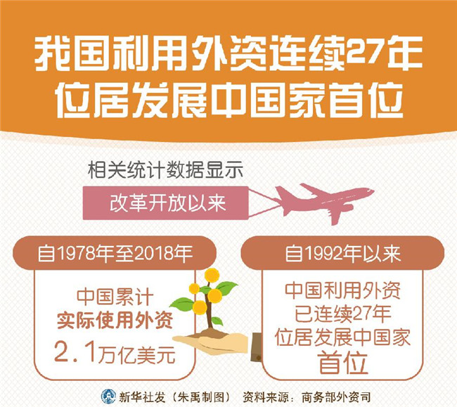 叶威透露,相关统计数据显示,改革开放以来,自1978年至2018年,中国累计实际使用外资2.1万亿美元;自1992年以来,中国利用外资已连续27年位居发展中国家首位。