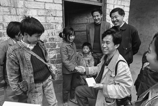 1996年5月,河南省新县王里河村,摄影记者解海龙和范明珠(左三)握手。赵新喜/摄