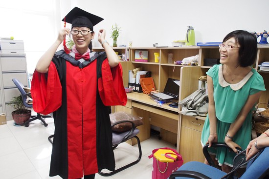 2013年6月,北京市海淀区中国科学院植物研究所,范明珠(左)经过20年寒窗苦读获得博士学位。