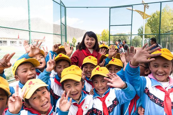 2019年10月21日,西藏自治区拉萨市曲水县达嘎乡其奴村,苏明娟和“大眼睛希望小学”的学生们合影。