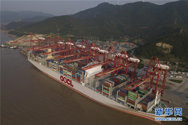 一艘货轮停靠在宁波舟山港穿山港区集装箱码头(2018年6月13日无人机拍摄)。新华社记者 黄宗治 摄
