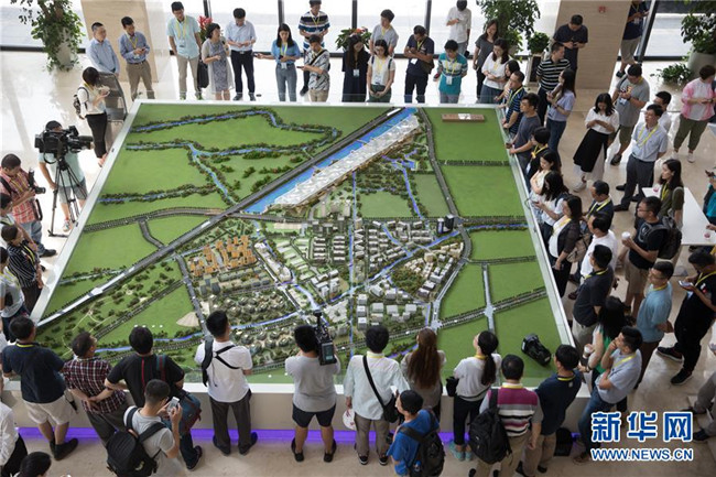 在上海临港松江科技城沙盘前,参观者听取建设规划(8月13日摄)。 G60科创走廊是利用长三角区位优势、良好的产业基础和高校科研机构集中等特点打造的区域协同创新发展的重要平台,将成为长三角更高质量一体化发展的重要引擎。新华社记者 金立旺 摄