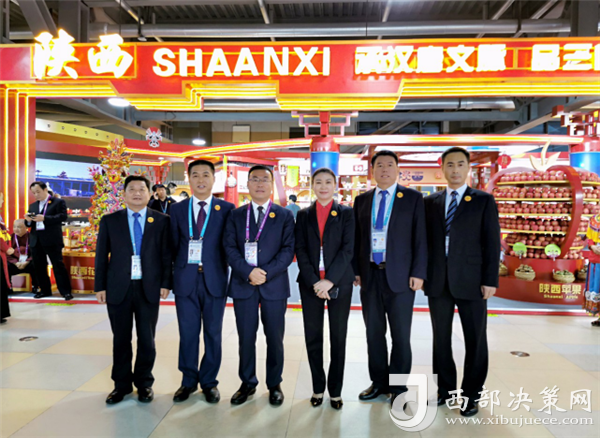 陕西省副省长徐大彤、省商务厅厅长赵润民、商务厅副巡视员贾银生视察西凤酒展馆与董事长张正、副总经理周艳花合影