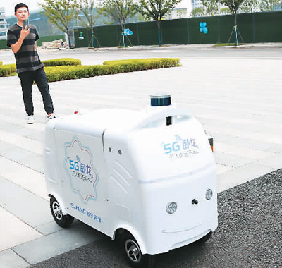 在江苏南京江北新区国际健康城,无人配送车在送货途中自主决策躲避障碍。新华社记者 李雨泽摄 |