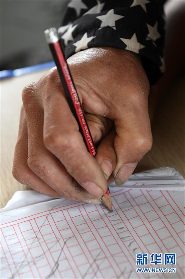 11月19日,在广西上思县那琴乡中心小学逢通村教学点,梁志雄手把手教学生写字。新华社记者陆波岸摄