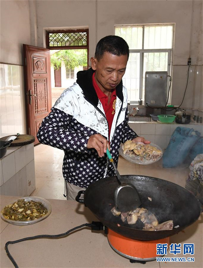 11月19日,在广西上思县那琴乡中心小学逢通村教学点,梁志雄在给学生做午饭。新华社记者陆波岸摄