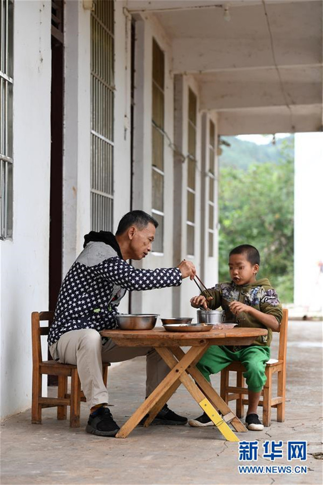 11月19日,在广西上思县那琴乡中心小学逢通村教学点,梁志雄和一名学生吃午饭。新华社记者陆波岸摄