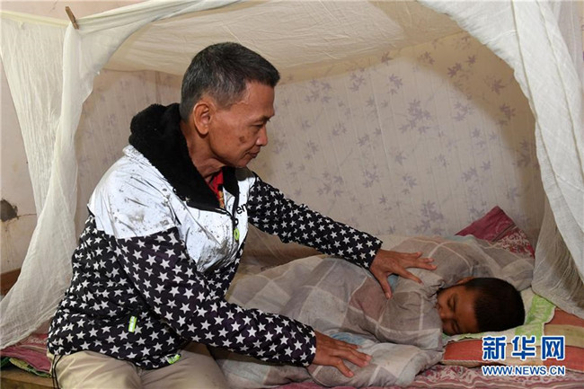 11月19日,在广西上思县那琴乡中心小学逢通村教学点,梁志雄在照顾一名学生午休。新华社记者陆波岸摄