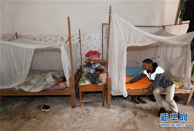11月19日,在广西上思县那琴乡中心小学逢通村教学点,梁志雄在铺自己的床铺准备午休。这个房间是梁志雄的办公室兼卧室。新华社记者陆波岸摄