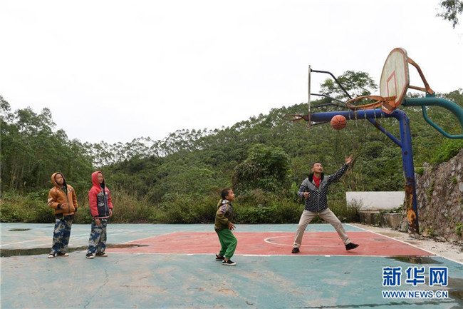 11月19日,在广西上思县那琴乡中心小学逢通村教学点,梁志雄教学生打篮球。新华社记者陆波岸摄
