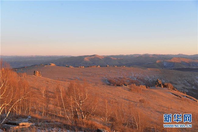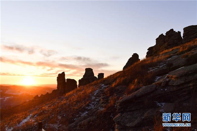 克什克腾石阵景区位于内蒙古赤峰市克什克腾旗,是国家5A级景区。冬日黄昏,在落日和晚霞的映衬下,克什克腾石阵景区一派壮美景象。 新华社记者 徐钦 摄