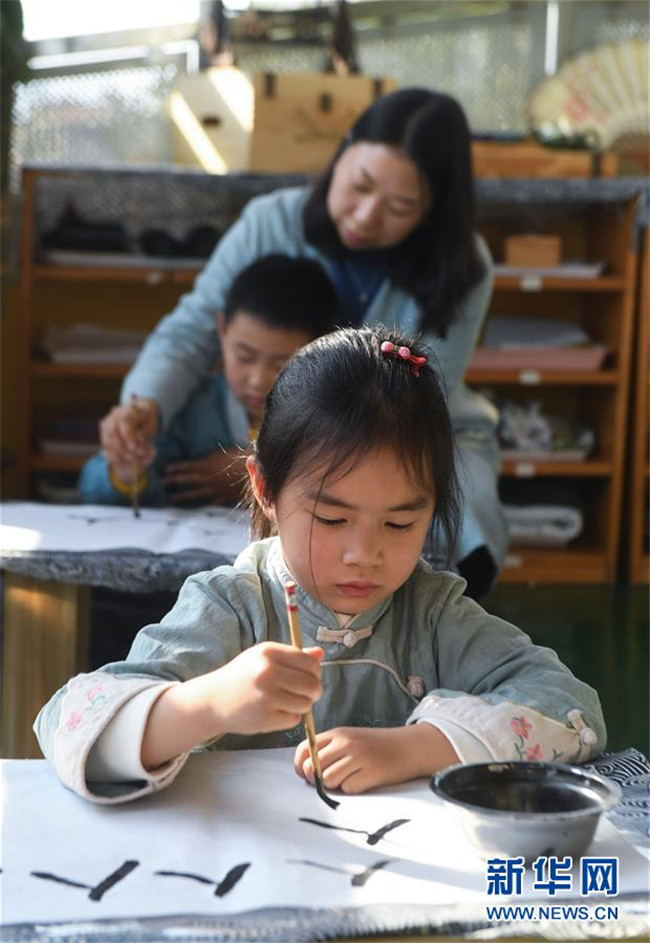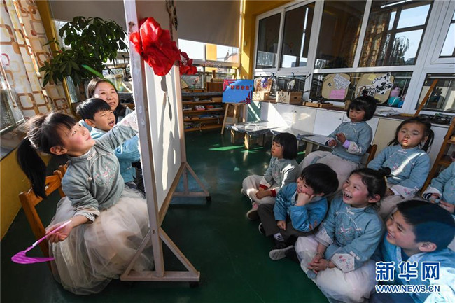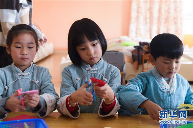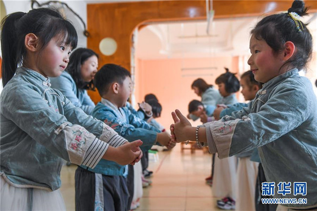 从2019年初开始,浙江省湖州市南太湖幼儿园开启“国学课堂”,通过设立传统礼仪、书法、剪纸、京剧、皮影戏等国学传统文化课程,致力于将国学经典教育渗透到幼儿日常生活学习中,培养幼儿的古典文化底蕴,教育幼儿从小培养良好的礼仪行为,让幼儿们在传统国学文化的滋养中成长。 新华社记者 徐昱 摄