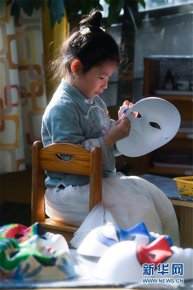 11月28日,小朋友在传统书画课上学习画脸谱。