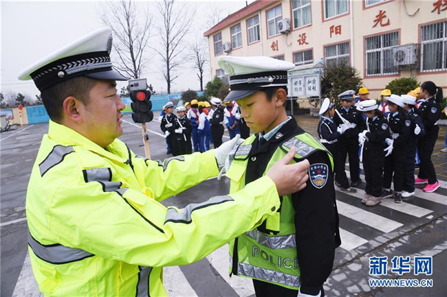 12月1日,东皋埠小学“小小交警队”队员们在安全教育活动中整理“警容”。新华社记者 李紫恒摄
