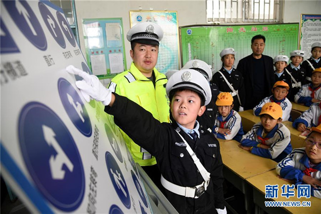 12月1日,东皋埠小学“小小交警队”王嘉瑞(前)在为同学们介绍交通标识。新华社记者 李紫恒摄