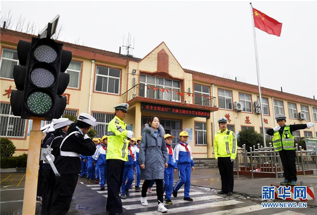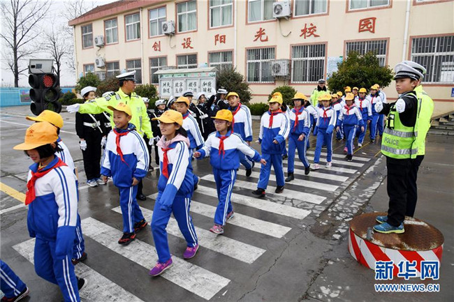 12月1日,东皋埠小学“小交警”在引导同学们安全通过“斑马线”。新华社记者 李紫恒摄