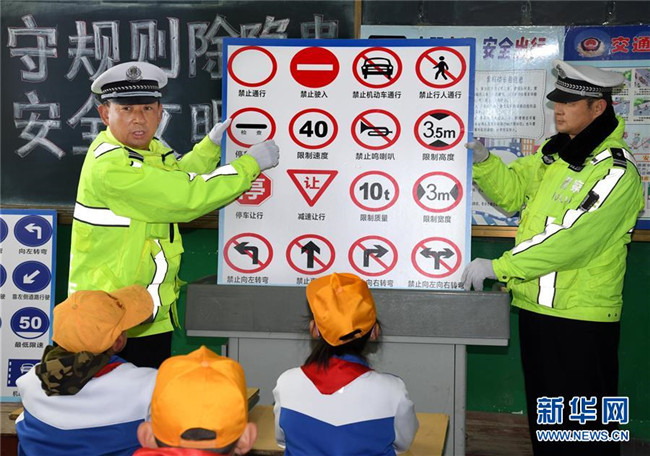 12月1日,民警刘泽春(左)在为东皋埠小学同学讲解交通安全知识。新华社记者 李紫恒摄