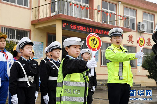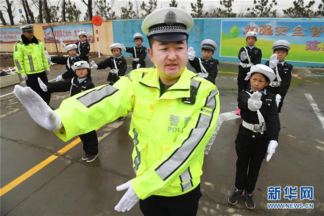 12月1日,东皋埠小学“小小交警队”的队员在学习交通指挥手势。 新华社记者 李紫恒摄