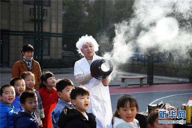 12月4日,科企社区小朋友在观看“烟圈炮”小实验。新华社记者 刘军喜 摄