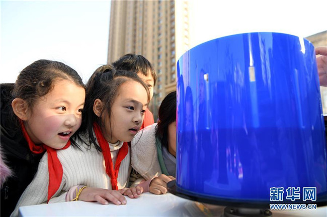 12月4日,科企社区小朋友在观看“烟圈炮”小实验。 新华社记者 刘军喜 摄