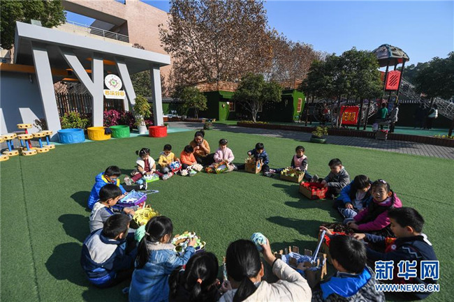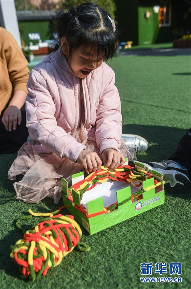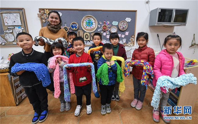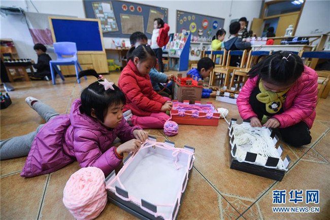 12月11日,小朋友们在老师的带领下用纸盒制作的工具编织爱心围巾。新华社记者 徐昱 摄
