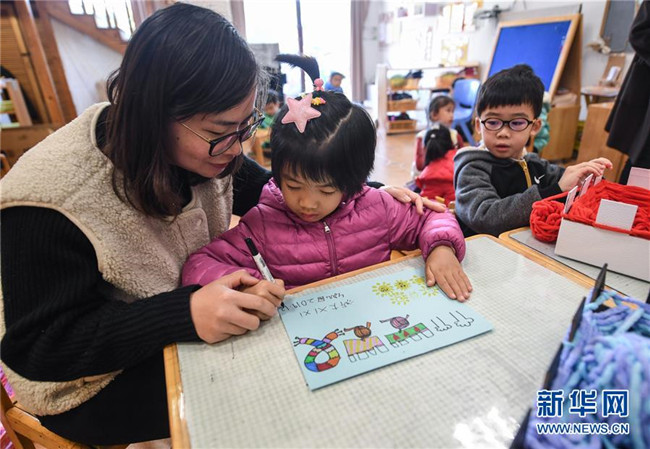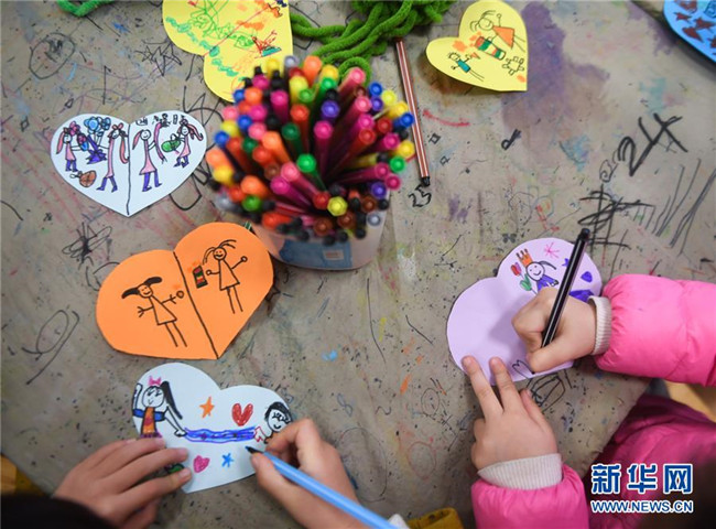 12月11日,小朋友在老师的带领下绘制爱心卡片,准备随围巾一起寄给西藏的小朋友们。 新华社记者 徐昱 摄