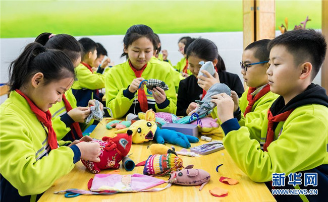当日,内蒙古呼和浩特市玉泉区通顺街小学“巧手社团”的学生在老师的指导下,利用身边的布头、丝绵等废弃物,制作生肖鼠布艺作品,表达对新年的美好祝愿。近年来,玉泉区教育部门大力推动“传统文化进校园”活动,在当地学校里开设剪纸、面塑、戏曲等民间艺术课程,让学生感受传统文化的魅力。 新华网 发(丁根厚 摄)