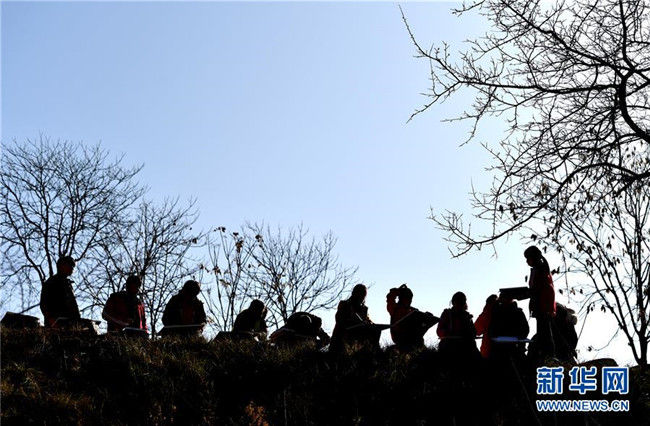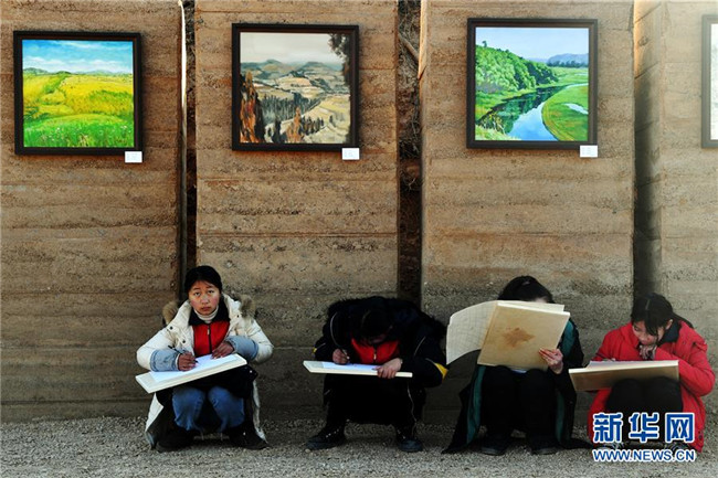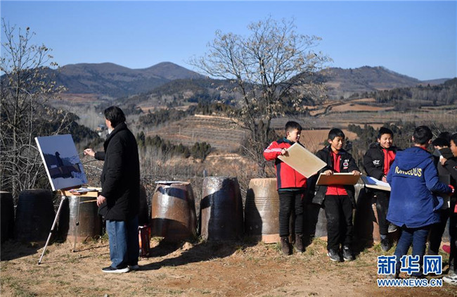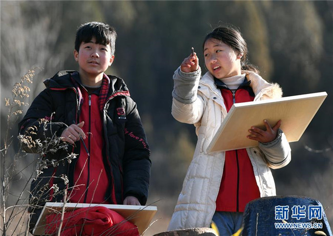 洛宁县罗岭乡初级中学学生在洛宁县前河村进行绘画创作(12月29日摄)。新华社记者 李嘉南 摄