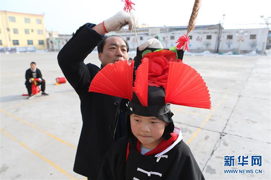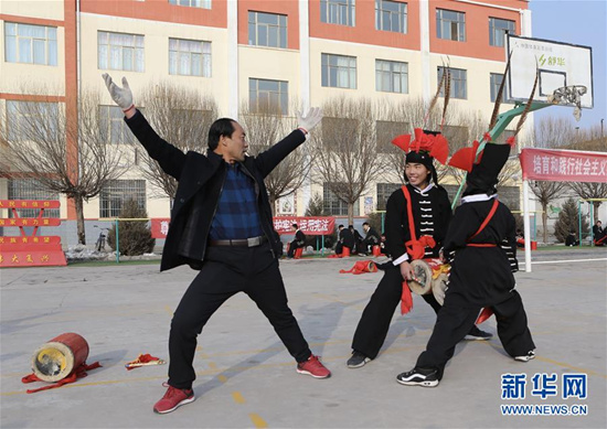1月9日,在甘肃省武威市凉州区四坝镇九年制学校,攻鼓子指导老师杨万航(左)为学生示范动作。