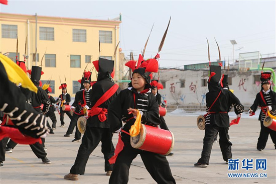 攻鼓子是发源于甘肃武威的一种民间鼓乐舞蹈,表演风格浑厚豪迈、威武雄壮,具有强烈的地域特色。2008年,凉州攻鼓子被列为第二批国家级非物质文化遗产。为更好地传承这项非物质文化遗产,甘肃省武威市凉州区四坝镇九年制学校组建攻鼓子艺术社团,开设攻鼓子校本课,定期由当地攻鼓子代表性传承人对学生进行指导,推动“非遗”攻鼓子艺术教育普及。 新华社记者 耿馨宁 摄
