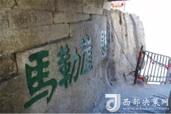 华山长空栈道上下皆是悬崖绝壁,铁索横悬,由条石搭成尺许路面,下由石柱固定。由于栈道险峻,故当地人有“小心九厘三分,要寻尸首,洛南商州”之说。这里只是探险之道,并非登山必由之路,胆小人就在升表台看看也就行了。所以在长空栈道的入口处,就有这样一块石刻,上边刻着“悬崖勒马”四个大字。悬崖勒马的字面意思就是说在高高的山崖边上勒住马。比喻到了危险的边缘及时清醒回头。面对长空栈道这样险峻的地势,游人确实要比正常情况下更加清醒。