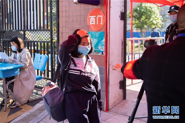 4月13日,在长沙宁乡市长郡沩东中学,学生进入学校时接受体温测量。新华社发(陈思汗 摄)