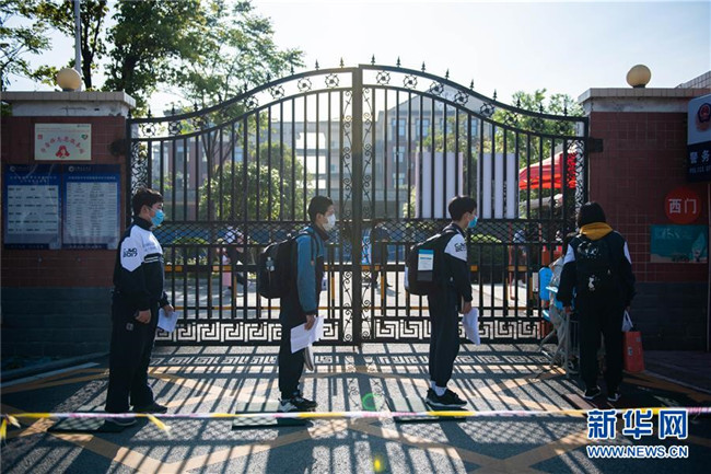 4月13日,在长沙宁乡市长郡沩东中学门口,学生排队进入校园。新华社发(陈思汗 摄)