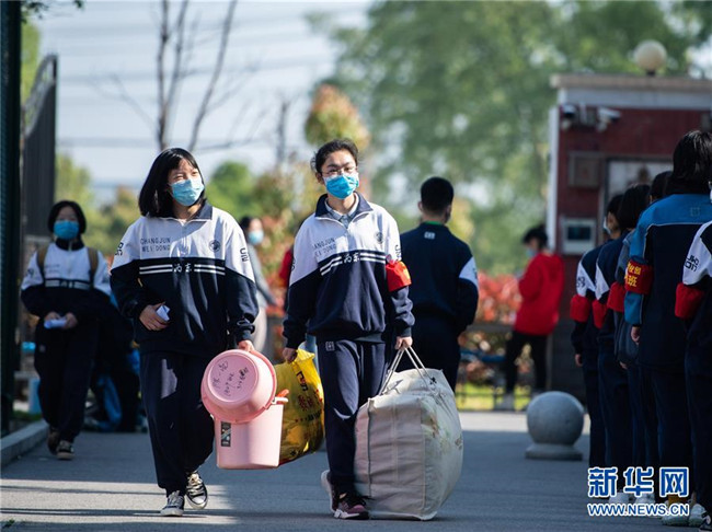 4月13日,在长沙宁乡市长郡沩东中学,住校学生搬运行李。新华社发(陈思汗 摄)
