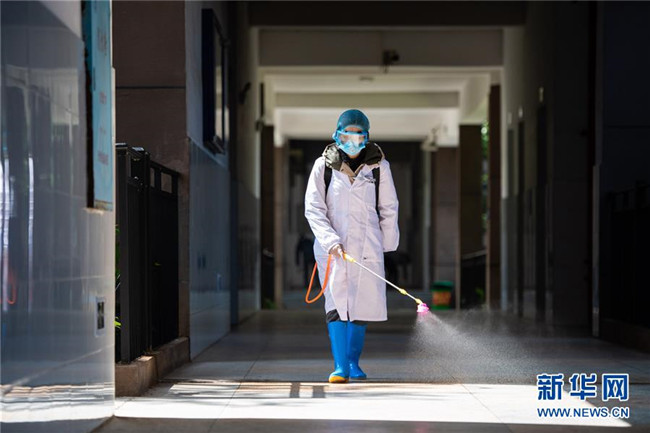 4月13日,在长沙宁乡市长郡沩东中学,校医在校内喷洒消毒液。新华社发(陈思汗 摄)