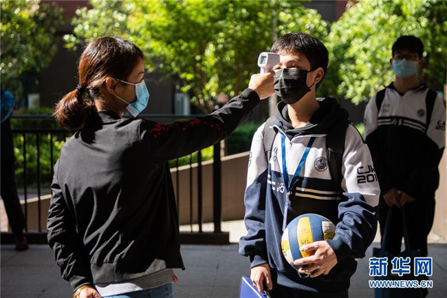 4月13日,在长沙宁乡市长郡沩东中学,学生进入宿舍前接受体温测量。新华社发(陈思汗 摄)