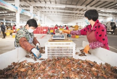 走进湖北潜江小龙虾交易中心,眼前一派忙碌景象。500多家水产商户已经复工,工人们忙着分拣包装,成箱的小龙虾被装上物流车辆,运往全国各地。