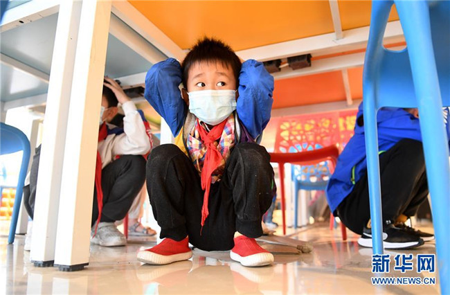 5月10日,合肥市淝南社区的儿童在进行地震防灾应急避险演练。 新华社记者 刘军喜 摄