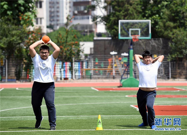 5月28日,北京市第十八中学初三年级的学生在体育课上投掷实心球。新华社记者 任超 摄