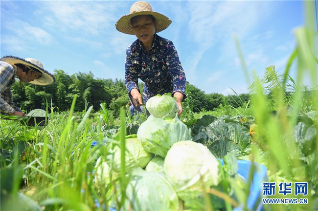 6月4日,在湘潭市雨湖区鹤岭镇龙安村,湘潭市仙女蔬菜产销专业合作社的农户在田里采摘包菜。 新华社记者 陈泽国 摄