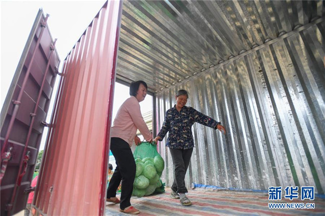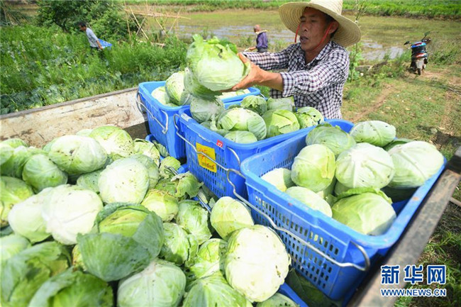 6月4日,在湘潭市雨湖区鹤岭镇龙安村,湘潭市仙女蔬菜产销专业合作社的农户将采摘的包菜装车。新华社记者 陈泽国 摄