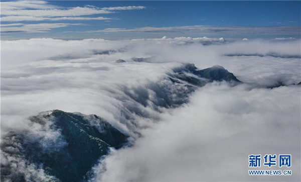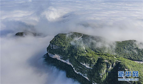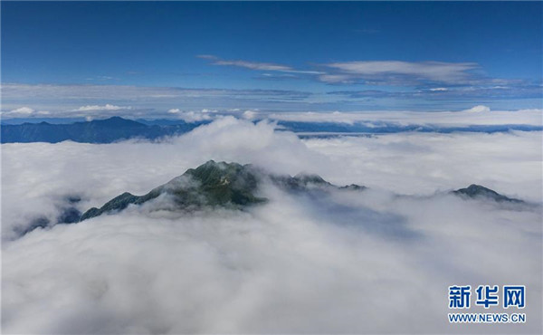 6月10日拍摄的汉中市南郑区龙头山景区的云海景观(无人机照片)。雨后初霁,川陕交界的陕西省汉中市南郑区龙头山旅游景区云海涌动,风光迷人。新华社记者陶明摄