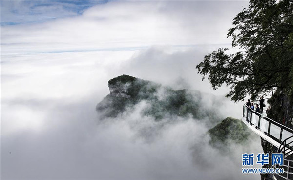 6月10日,游人在汉中市南郑区龙头山景区玻璃栈道上观赏云海。雨后初霁,川陕交界的陕西省汉中市南郑区龙头山旅游景区云海涌动,风光迷人。新华社记者陶明摄