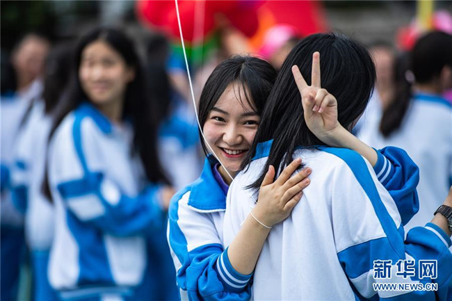 6月27日,乌当中学高三学生在毕业典礼上和同学拥抱。 新华社记者 陶亮 摄