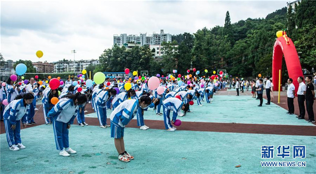 6月27日,乌当中学高三学生向老师鞠躬表达感谢。新华社记者 陶亮 摄