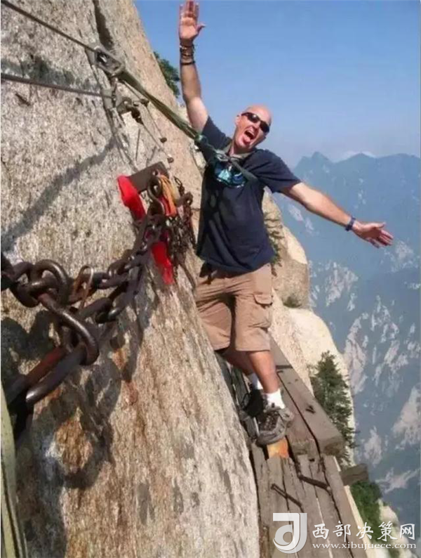 喜欢攀岩徒步,似乎是很多老外的一种标志性运动。几个热爱徒步攀岩的老外,在华山的栈道上摆pose,挑战这种世界上最危险的徒步栈道。
