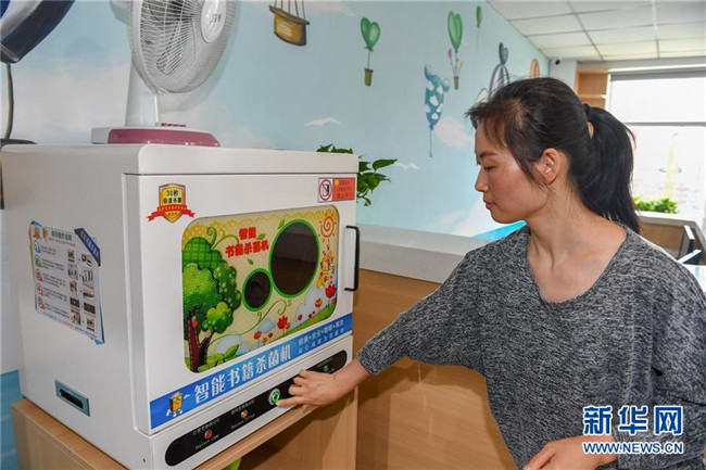 7月2日,在长春市少年儿童图书馆平阳社区绘本主题分馆,管理员金敏为图书进行消杀。 新华社记者 张楠 摄