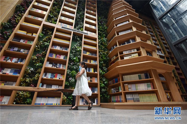 7月5日,在河北省定州市新华书店,一名小朋友从书架前走过。 新华社记者 朱旭东 摄