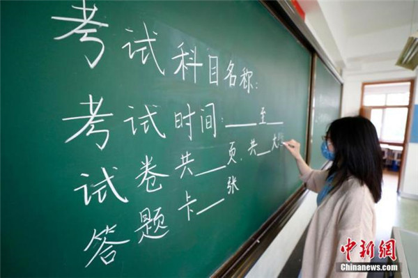 7月3日,北京十二中老师布置考场。该校共设标准考场33间,备用考场3间,将有660名考生在此考试。 中新社记者 富田 摄