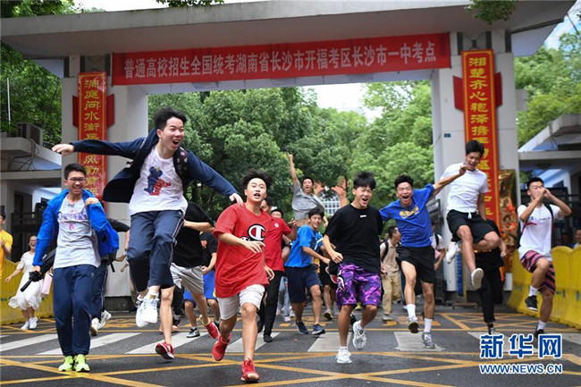 7月8日,考生们在高考结束后跑出湖南省长沙市一中考点。 当日,全国部分地区2020年高考结束。 新华社记者 薛宇舸 摄